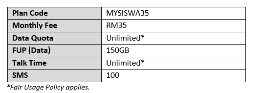 FUP of 150GB applies for MySISWA plan. Upon reaching FUP, your data will throttle to 512Kbps.