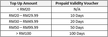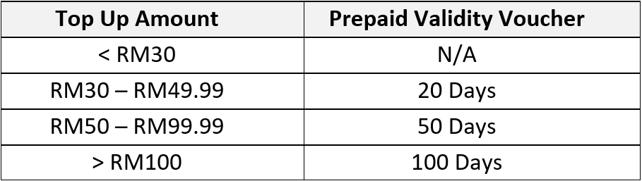 You will receive one (1) complimentary 20 Days Prepaid Validity voucher when you top up RM45 during the campaign period.
