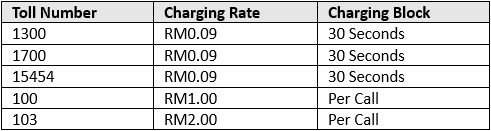 10.1. Usage of Talk Time is not applicable to call to special numbers such as 1300, 1700, 1800, TM100, or any other toll-free numbers. The charging rates for toll-free numbers are stated below: