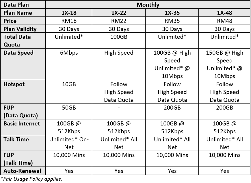 59. Each subscription to 1X-18 or 1X-22 data plan will include an additional complimentary thirty (30) days of Prepaid Validity, effective from 21st July 2025 until further notice. The complimentary Prepaid Validity will be credited to Subscriber’s account within three (3) working days upon successful subscription to the data plan. The maximum prepaid validity to be accumulated from every subscription of 1X-18 or 1X-22 data plan is 180 days.